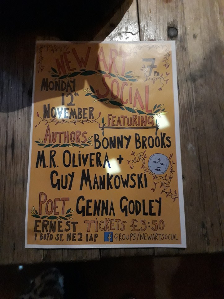 Last night was my first trip to Newcastle literary salon, New Art Social, at Ernest in Ouseburn. A low key, friendly night (£3.50 a ticket if you aren’t reading) in the back room of the super-chilled Ernest (though there was a loud party in the front bar, which meant some of the readers were competing with booze-fuelled revelling), it was a really interesting night. I was there to support a friend who was reading a short story she just had published in the magazine Lungs, but the standard throughout was pretty high and I was very taken with some of the work, a mix of novel extracts, short stories and poems.