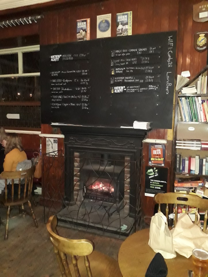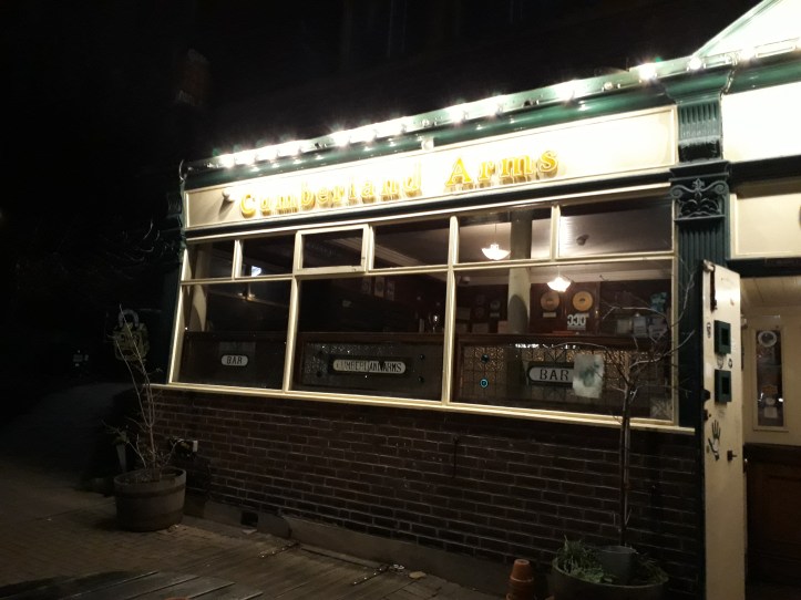 In search of more adult entertainment (calm down, I just mean beer), Linda and I decided to do a mini pub crawl of the area. L is a real ale enthusiast, so we decided to retrace the steps of a recent real ale tour she had done, stopping first at the excellent Brinkburn Brewery St Bar and Kitchen, another one of those Ouseburn venues that skillfully balances the hipster regeneration vibe of the area with actually being a nice place to hag out, and then onto more traditional climes – the proper old-fashioned pub that is the Cumberland Arms, a warm, welcoming space (where we met one of the dogs we had seen in the Cluny, whose owners had clearly had the same idea) where we had a couple of fine ales in front of a roaring fire before wending our way home.