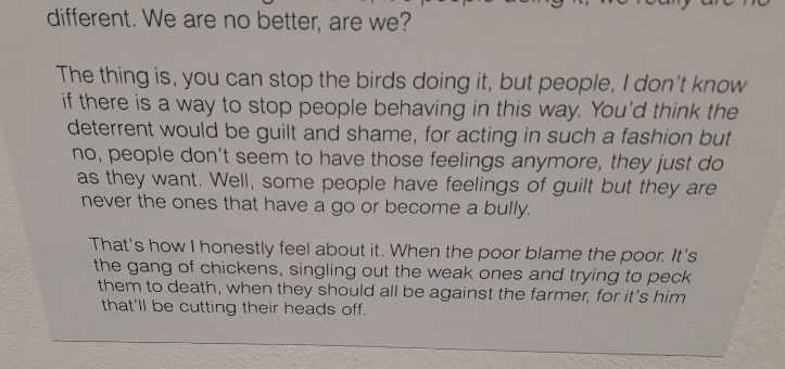 Running till March – and free – it’s an incredibly powerful show. Mortram’s pictures show the brutalising effects of austerity on the disabled, the poor, the vulnerable – and, crucially, his subjects get to speak. Most of the photos are captioned with quotes by their subjects, which makes it feel like they have some agency in this: we are not just poverty tourists, peering at their misery. And it is, for the most part, misery, with both loneliness and the abuse and cruelty of strangers a common theme, especially for those who are mentally or physically disabled. They are often insightful and eloquent about their situations – one quote in particular stuck with me, from “David”, who compares the poor to chickens, pecking at the weakest in their midst, instead of uniting against the farmer who will be cutting off their heads.