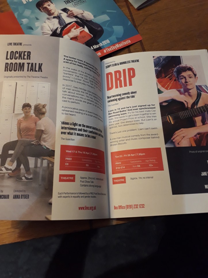 Last night’s visit to Live Theatre started with more drama than I would have liked. All the Metros were off, so Heworth Metro was in chaos as people desperately tried to get on a bus or find a taxi (ah, it was like being back in London!). The situation was made worse by the fact that a young man had been taken very ill, and when I arrived was lying on the floor of the station in what looked to be a state of semi-consciousness, so the Metro staff were not only having to contend with lots of commuters trying to figure out how to get home, but the disruption of an ambulance arriving and a medical emergency. (Props to them for managing, and doing so with politeness and sensitivity. At one point I heard one of the staff gently ask the fallen man, “Is there a girlfriend or a boyfriend we could call for you?” No weighted pause between the two options, as if the latter might be some reluctantly acknowledged choice. It occurred to me, fleetingly, that it is in tiny gestures of inclusion and kindness like this that the world is saved.)