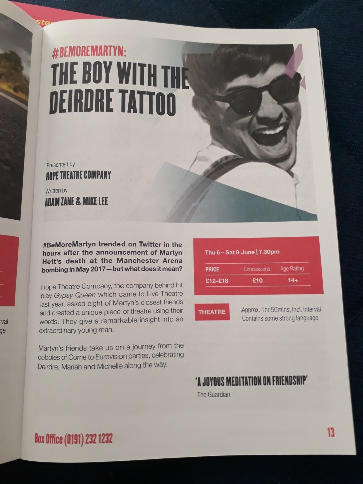 Douglas said that, alongside politics, which is baked into the bricks of Live Theatre, one of the season’s themes was ‘growing up’. Fitting neatly into this are teen comedy Drip, and feminist piece Ask Me Anything, for which we have been promised the theatre will be transformed into a teenage girl’s bedroom, while #BeMoreMartyn: The Boy with the Deidre Tattoo, by Hope Theatre (who did the well-received Gypsy Queen) looks at a young life cut short, celebrating Manchester Arena bombing victim Martyn Hett.