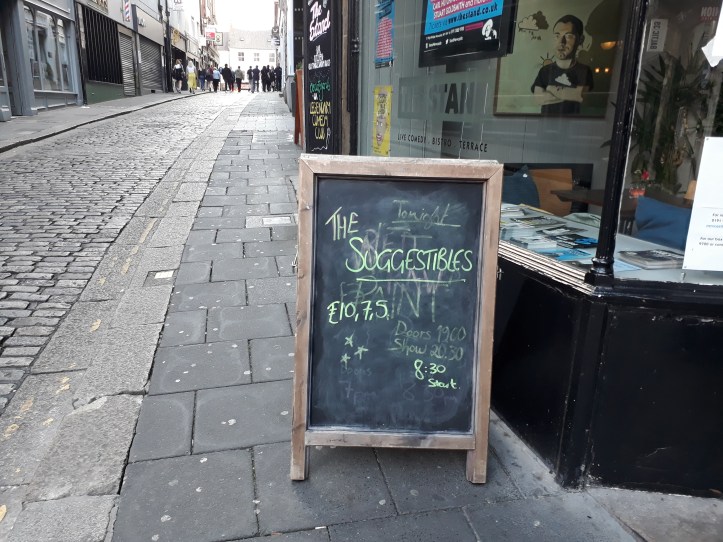 Comedy venue The Stand on High Bridge Street has been on my list of venues to check out since I moved back to Newcastle. It looks small from the street – like a nice but fairly narrow bar – but there’s a pleasant and fairly large beer garden out back and the venue itself in the basement is nicely laid out and a decent size, with plenty of toilets and clearly visible fire exits (I am of an age when both of those things matter to me: never a fan of subterranean spaces, I always like to see clear paths of egress.) It also does a good range of food, including veggie options, though my friend and I stuck just to wine.