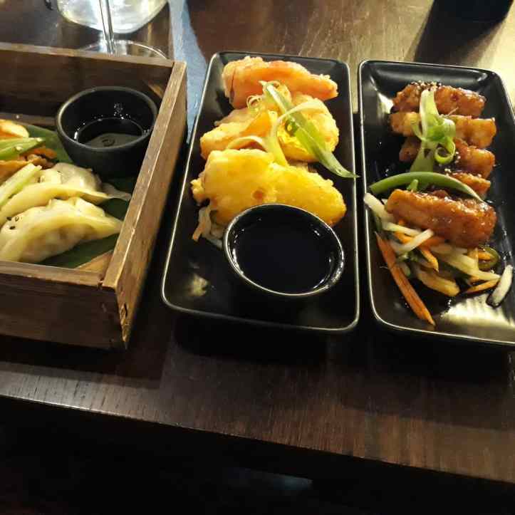 A lux looking Pan-Asian restaurant with a great cocktail menu, The Muddler was offering 3 dishes for £15 as part of Restaurant Week. With plenty of vegetarian options (and a comprehensive allergy menu so I could be sure there was nothing on there I couldn’t eat), there was lots to choose from (and when I couldn’t decide whether my gyoza should be steamed or fried, the waitress offered to do half-and-half: yum!). M went for a mix of meat and fish dishes (the salmon was her favourite), while I had tofu, tempura and vegetable gyoza, which were all delicious, and surprisingly substantial: 3 dishes was more than enough! We both had a cocktail from an extensive and well-thought-out menu, and were both pleased with our choices.