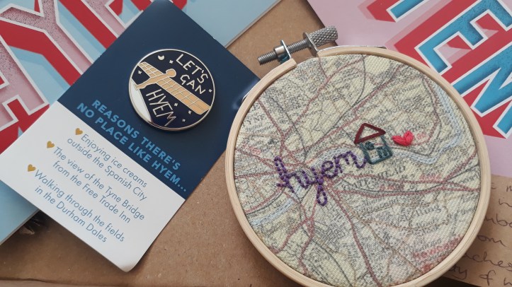 This month’s goodies were themed around the word ‘hyem’ (Geordie for ‘home’) and the box contained two greetings cards by Ebony Newton, an Aissa Tyley pin badge, and Nessie Wise embroidery hoops. (Obviously the cards might not be particularly useful unless you know someone who is moving house, or feels particularly homesick – I’m hoping future boxes will be more generic, as one of the reasons I quit my Papergang subscription was they kept including such odd cards that literally couldn’t ever think of anyone to send them to, and I say this as someone who sends dozens of greeting cards a year!)