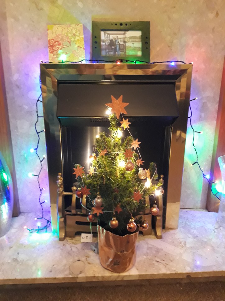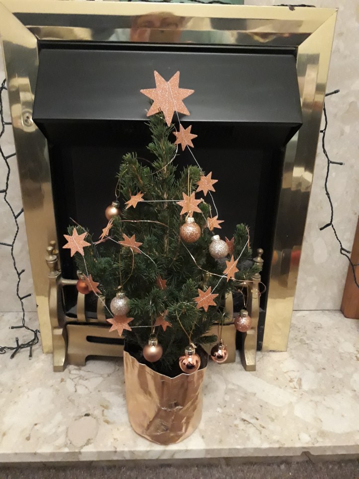 Still, I was delighted to receive this gorgeous mini tree from Bloom & Wild from my friend F yesterday. Completely self-contained – it comes with battery operated lights, paper and bauble decs, the gold ‘tub’ and soil, and can be replanted afterwards – it is idiot-proof even enough to survive my cack-handedness, and brightens the place up nicely, hopefully distracting from the fact I’ve already emptied the advent calendars…
