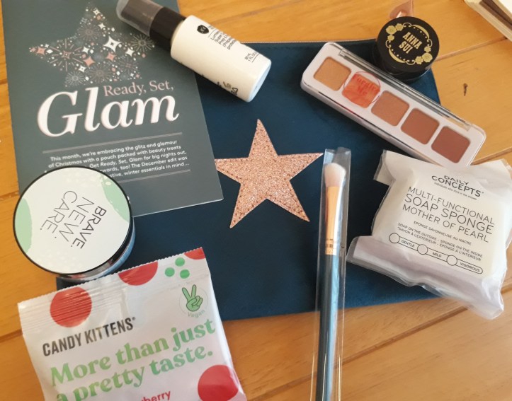 A nice little festive parcel this, coming in a lovely pouch instead of a box. It contains a good mix of stuff – eyeshadow, a soap sponge that you get multiple uses out of, a body shimmer, foundation primer, hair prep spray and make up brush. (I am hoping the spray will help me tackle my breakaway hair). I still think I’ll likely cancel this in the spring – I feel a bit guilty about the environmental impact of all these travel sizes, and I now have more cosmetics and toiletries than I can use – but I admit I DO love getting a parcel…