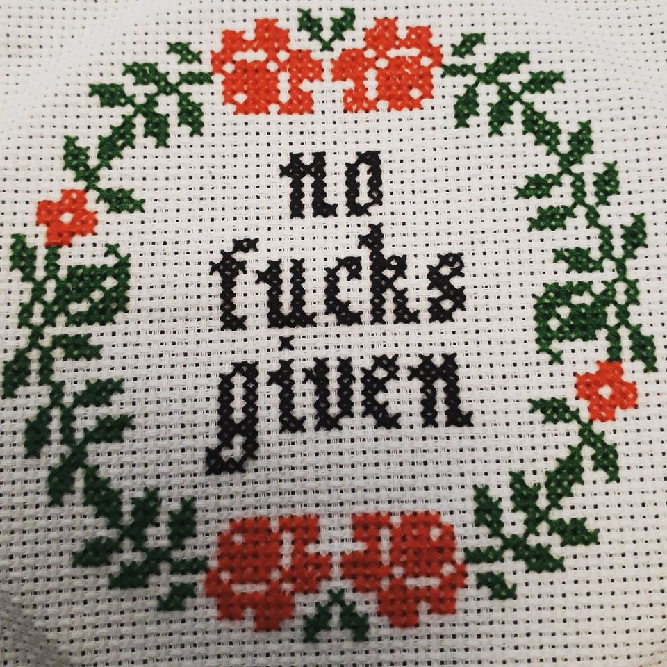 One of the first makers I encountered when I started what has become a cross-stitch obsession was local vendor Innocent Bones. I’ve now bought a few kits from her – this heart and dagger is my latest – and even though I’ve reached a stage now where I generally prefer to do my own designs, I still buy the odd one. (My friends love them: I’ve ended up doing this Don’t be a Dick and No Fucks Given (which I colourised from her monochrome pattern) twice because people asked me for them.