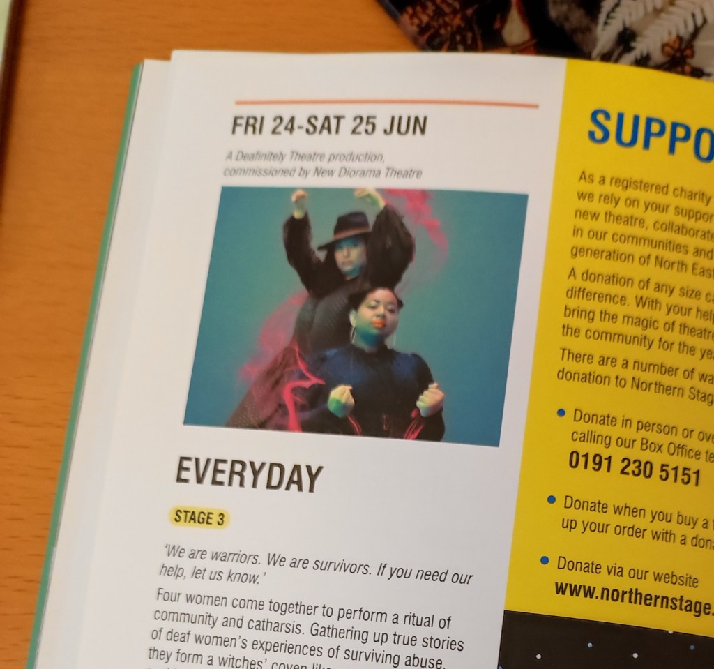 Deafinitely Theatre’s Everyday – which is devised theatre based on interviews with deaf women who experienced domestic abuse – looks like a hard-hitting but necessary watch, and also boasts probably my favourite poster of the season (my crappy photography notwithstanding!). The importance of not just reaching disabled audiences (with Frozen Light’s 2065, for example, targeting audiences with profound and multiple learning disabilities) but making a space for disabled creatives to tell their own stories is reflected not just in the programming of Everyday, but also Snatched, disabled actor Melissa Johns’ story of coming to terms with her body being put in the public domain when her private photos are hacked.